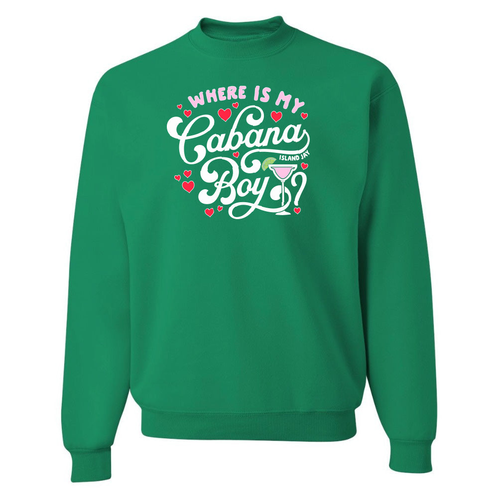 Green sweatshirt with text 'Where is my Cabana Boy?' on a white background