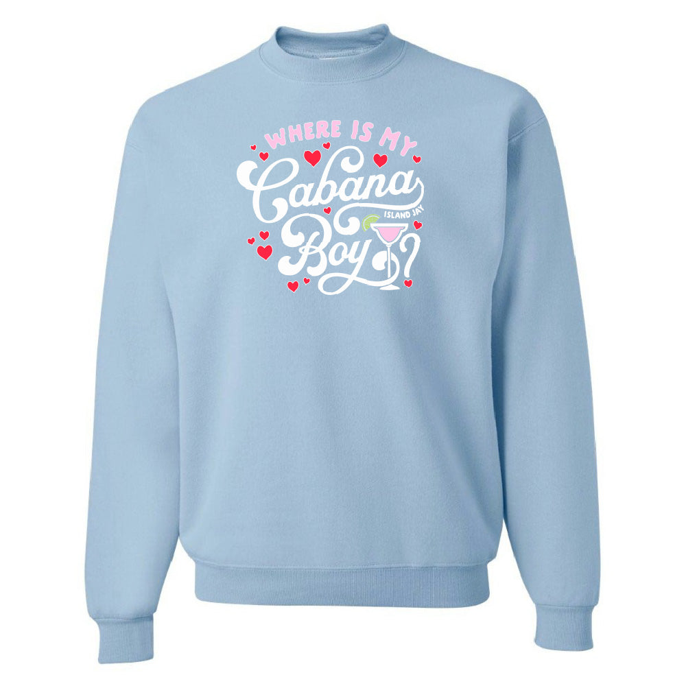Light blue sweatshirt with 'Where is my Cabana Boy?' text and graphics on a white background
