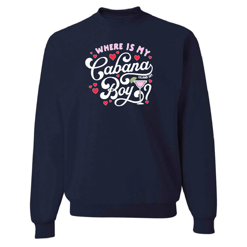 Navy blue sweatshirt with 'Where is my Cabana Boy' text and graphics on a white background