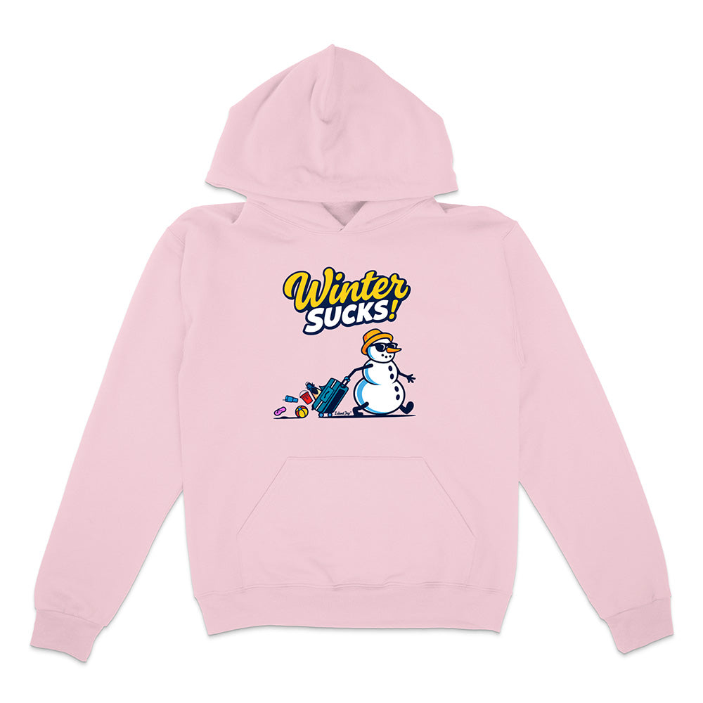 Pink hoodie with a snowman graphic and 'Winter Sucks!' text on a white background