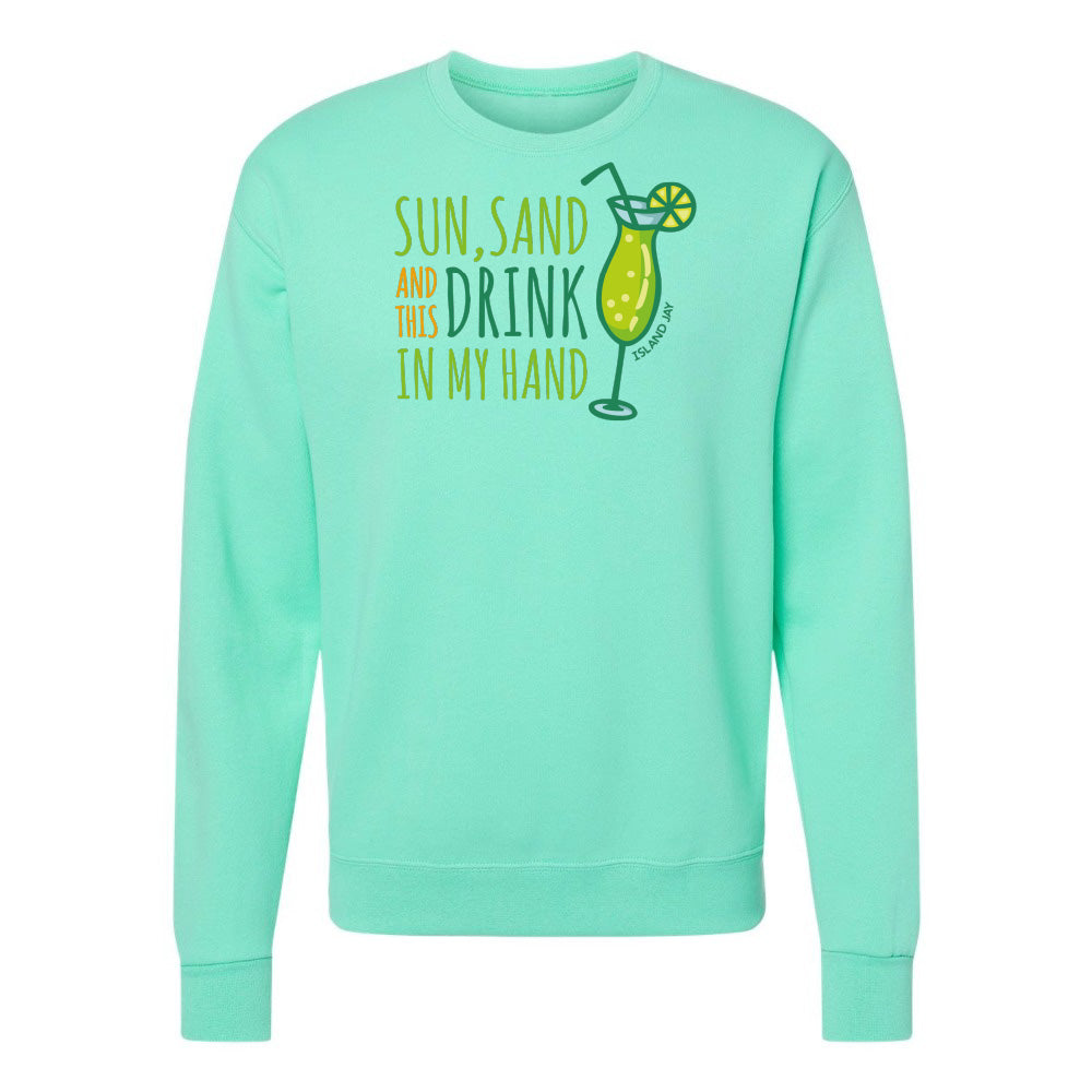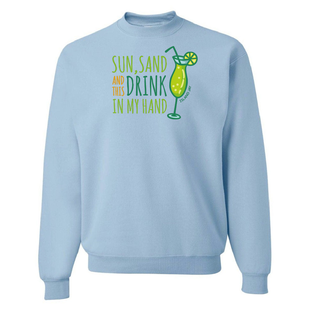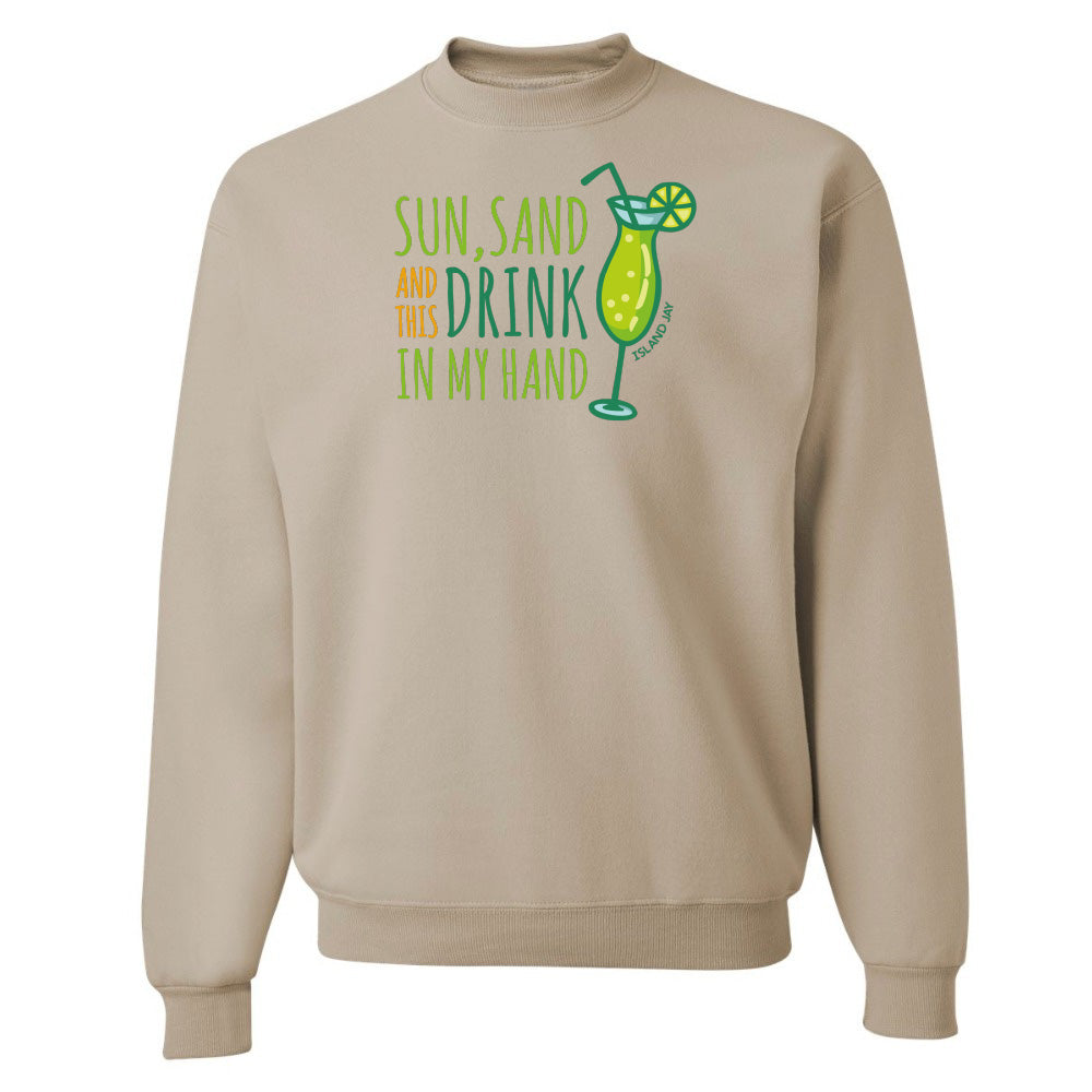 Pink sweatshirt with a graphic and text 'Sun, Sand and Drink in My Hand' on a white background