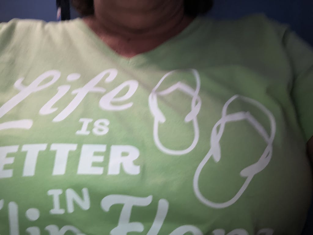 Sneakers? Maybe? Shoes? Too stuffy! Remember to always keep a spare set of Flip Flops handy.- 100% Preshrunk Cotton Ladies Cut T-Shirt.