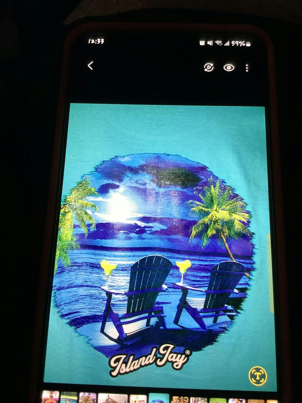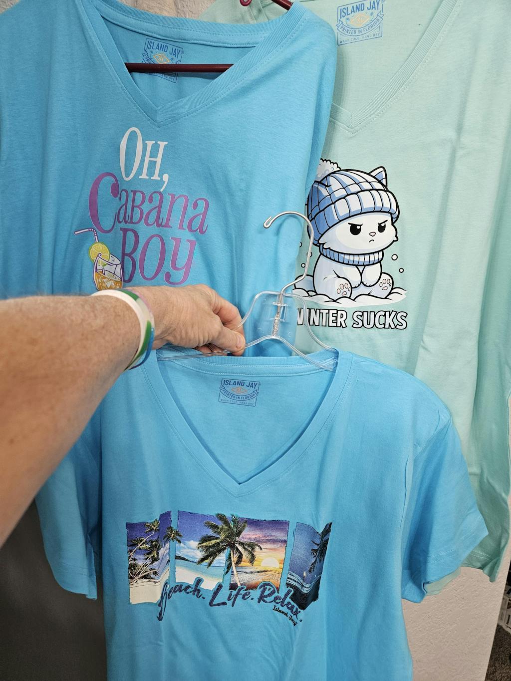 I totally love Island Jay shirts! I have several..my favorite is the one with the two beach chairs on the back with two margaritas!