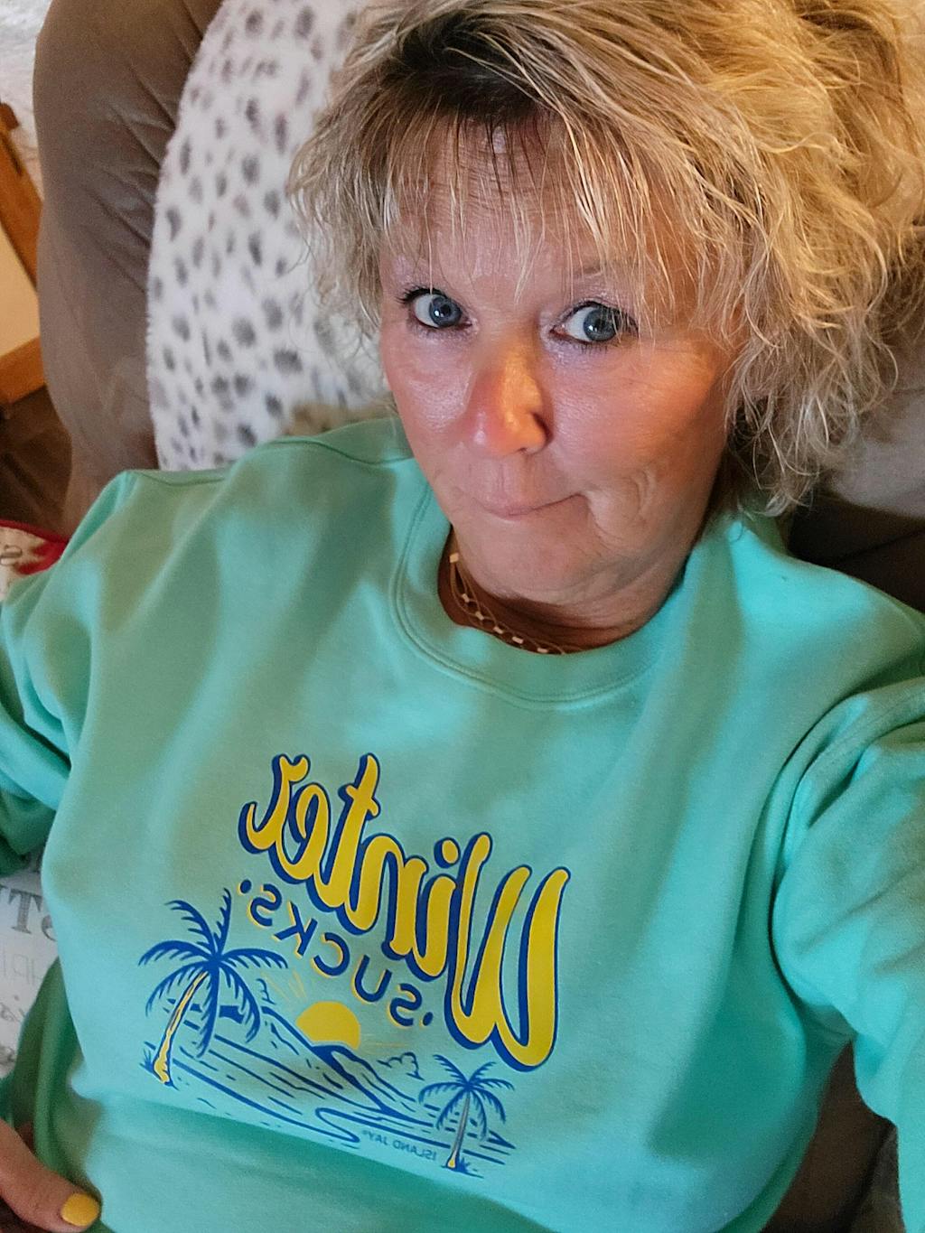 Love my "winter sucks sweatshirt"! I have gotten so many comments on it! The color, the fit , the quality! All a ten!